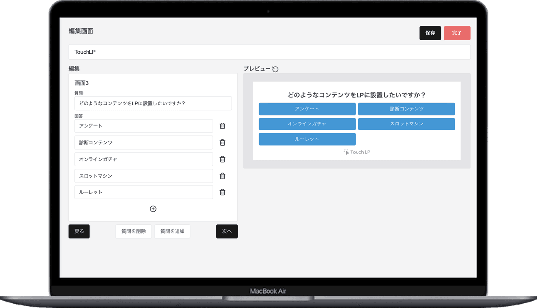 アンケートなどのインタラクティブコンテンツをノーコードで作成できます。 質問などの項目を自由にカスタムして、あなただけのコンテンツを作成しましょう。