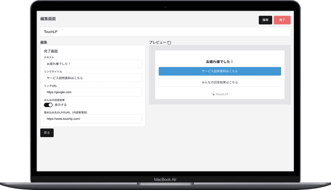 コンテンツの最後にサンクスページへのリンクを設置することができます。 サービス説明資料や次のステップへの案内など、ユーザにとって有益な情報を提供しましょう。