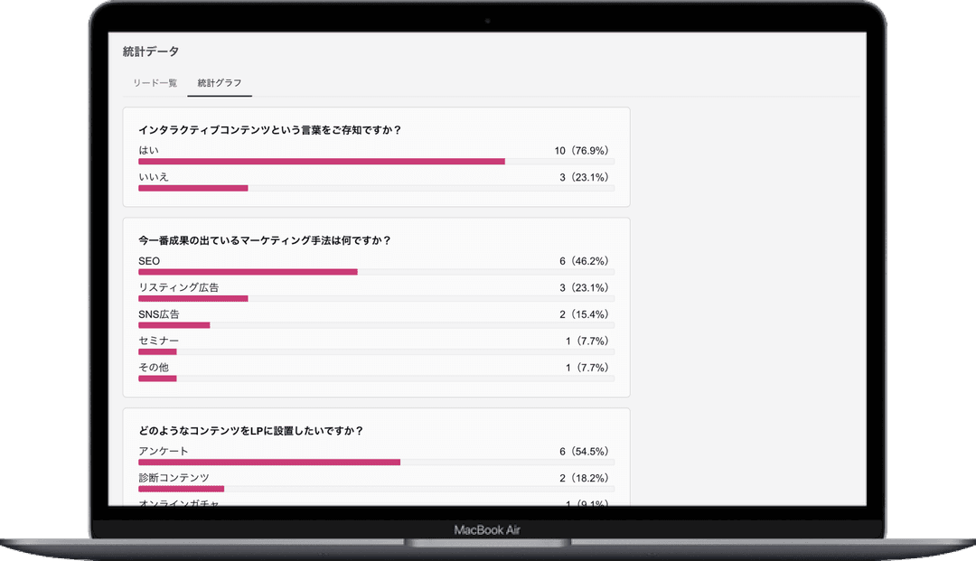ユーザの回答結果やリード情報をグラフで確認することができます。 ユーザの反応を確認しながら、コンテンツの改善を行いましょう。