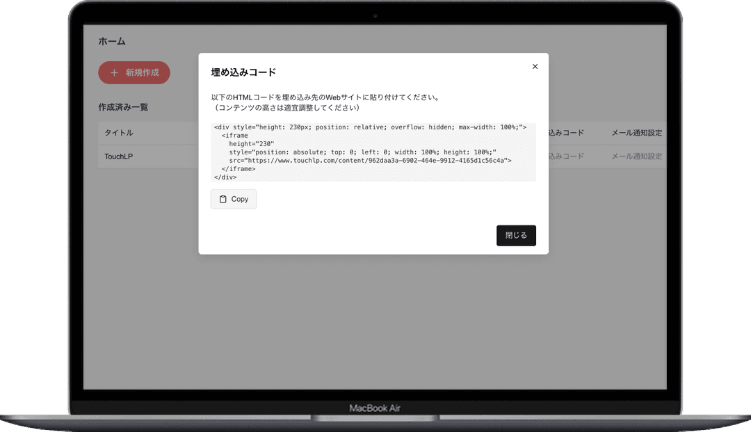 作成したコンテンツの埋め込みタグを発行することができます。 タグをLPに貼り付けるだけで、LPにコンテンツを表示することができます。